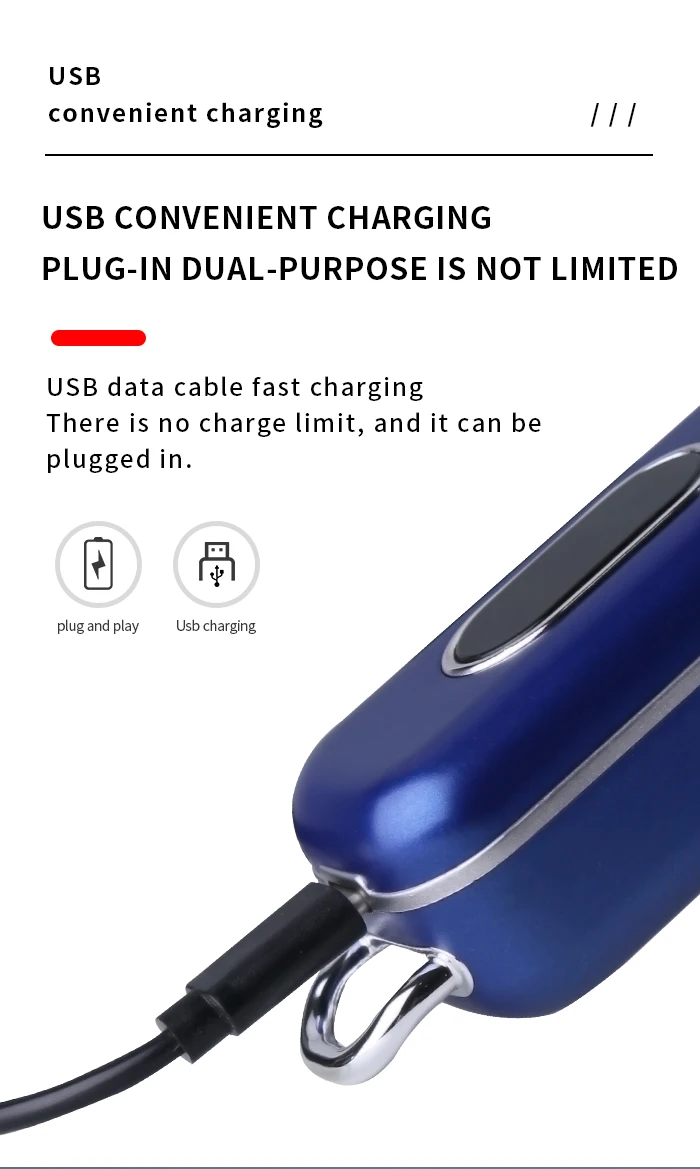 2. Carregamento USB: Este aparador de cabelo é carregado via USB, eliminando a necessidade de carregadores tradicionais e facilitando o carregamento com uma variedade de fontes de energia. Esse recurso é altamente conveniente para o uso em movimento.