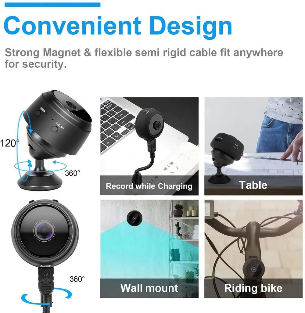 -Este banheiro pequeno da câmera tem um ímã incorporado, pode trabalhar bem com todo o material do ferro, facilmente lugar em qualquer lugar. Esta pequena câmera com um cabo de carregamento rígido e base mágica, ao carregar durante a gravação, você pode girar manualmente o ângulo de gravação 360 graus.
