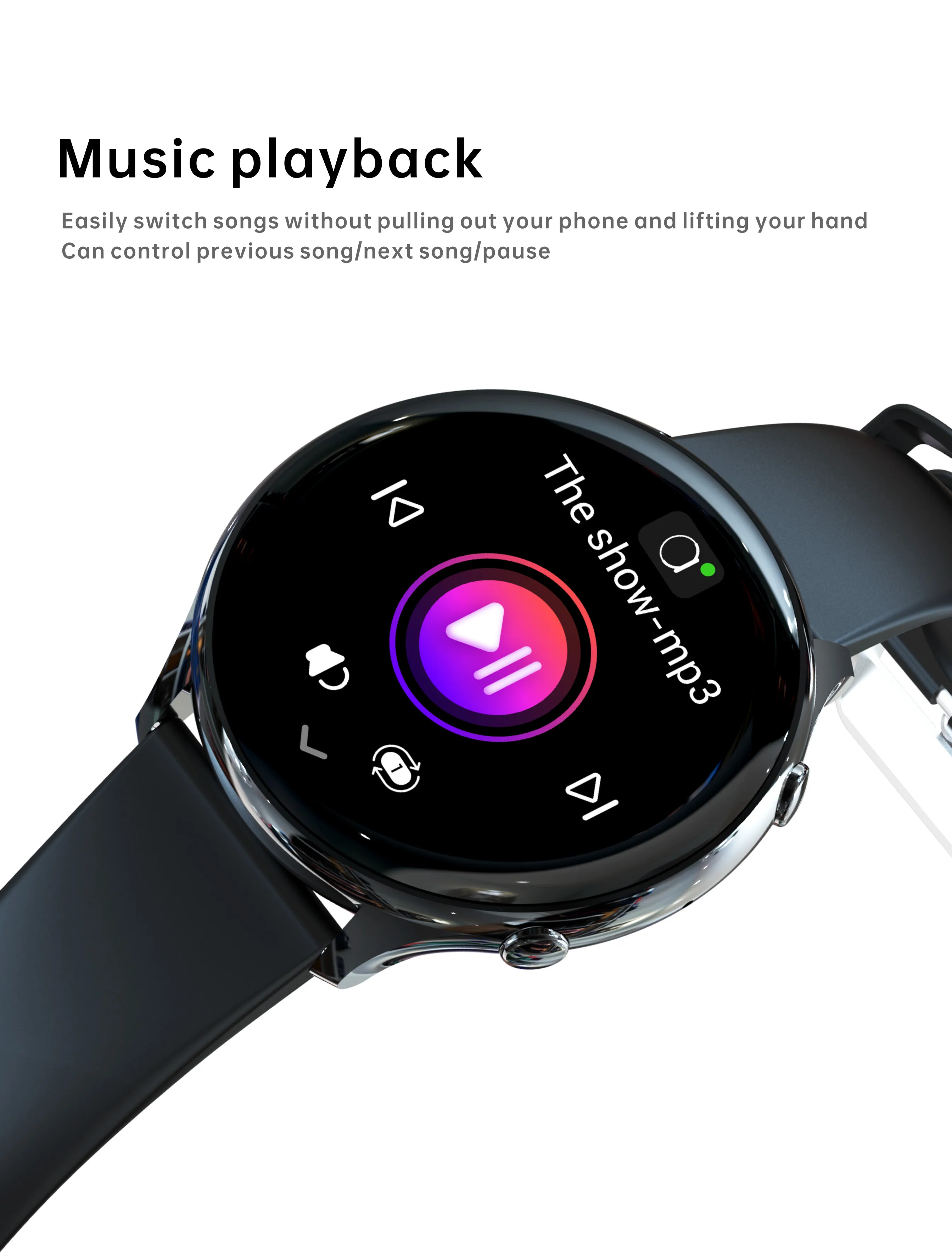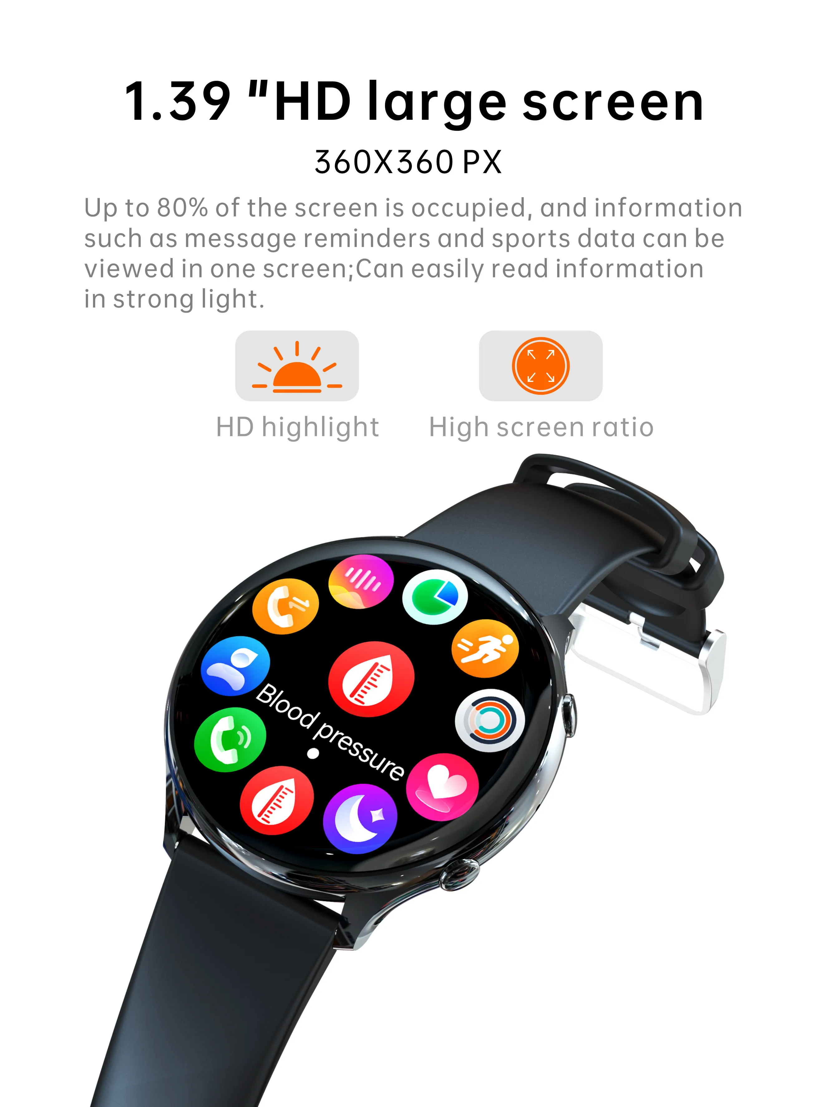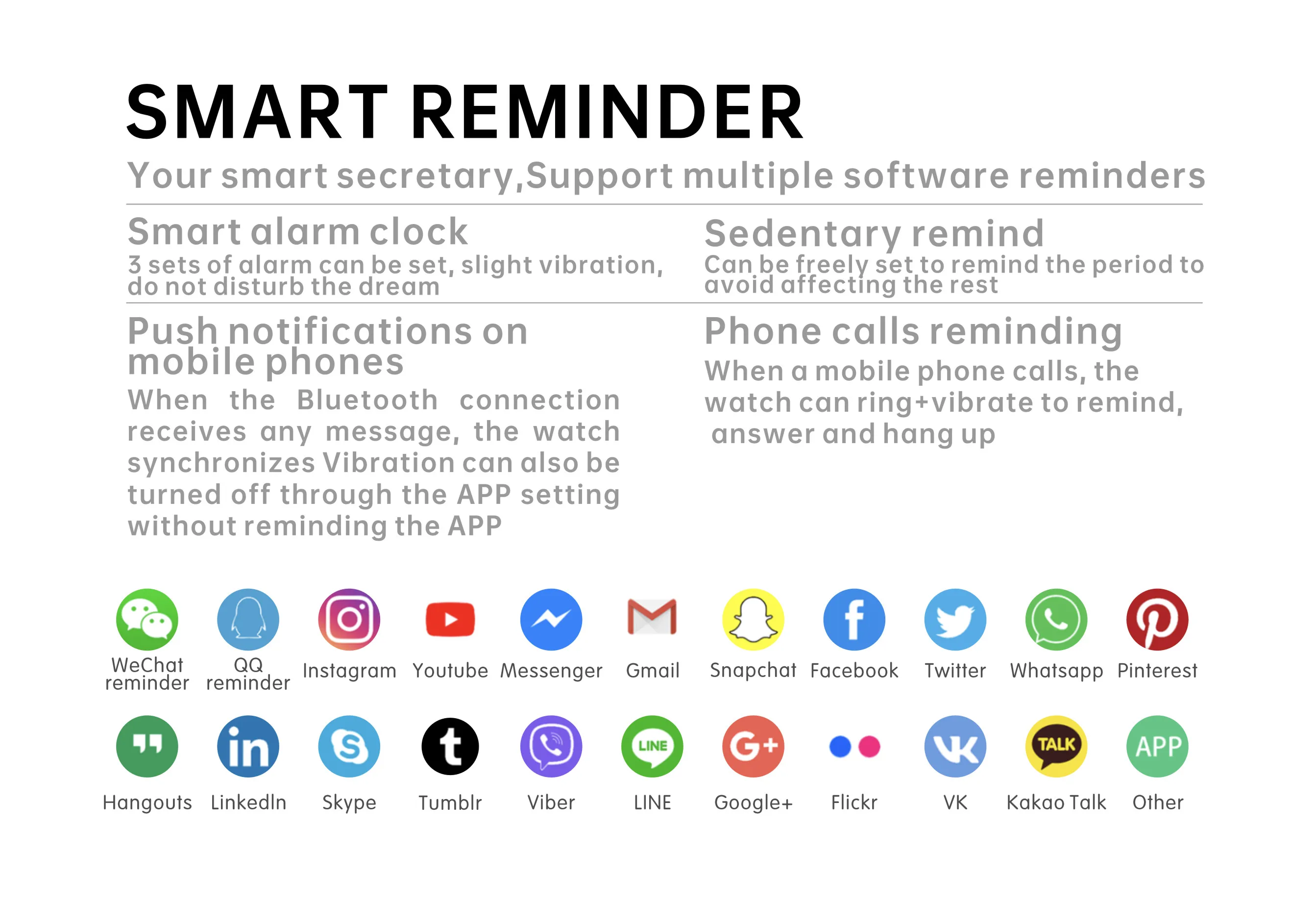 Atender/fazer chamadas telefônicas, monitoramento da frequência cardíaca, monitoramento da pressão arterial/oxigênio ECG, monitoramento do sono, passo do exercício/consumo calórico/tempo do exercício/exercício wechat, lembrete de chamada e exibição, mensagem push e display, fotografia de controle remoto, música tocando, modo multi-exercício, lembrete sedentário, configuração de despertador, vem com 5 dial, APP pode personalizar o dial